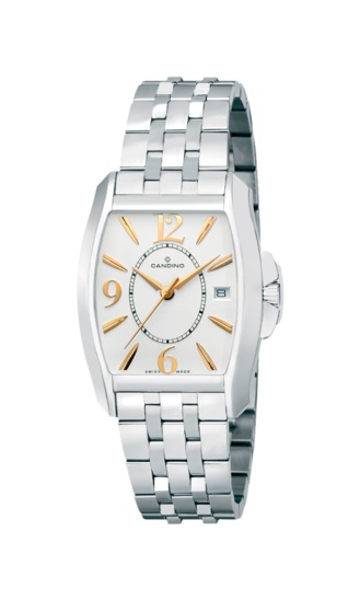 Reloj Candino con esfera blanca con número y agujas en dorados, calendario a las 3. Brazalete de acero con doble cierre de seguridad, Resistente al agua hasta los 50m. Garantía internacional de 3 Años